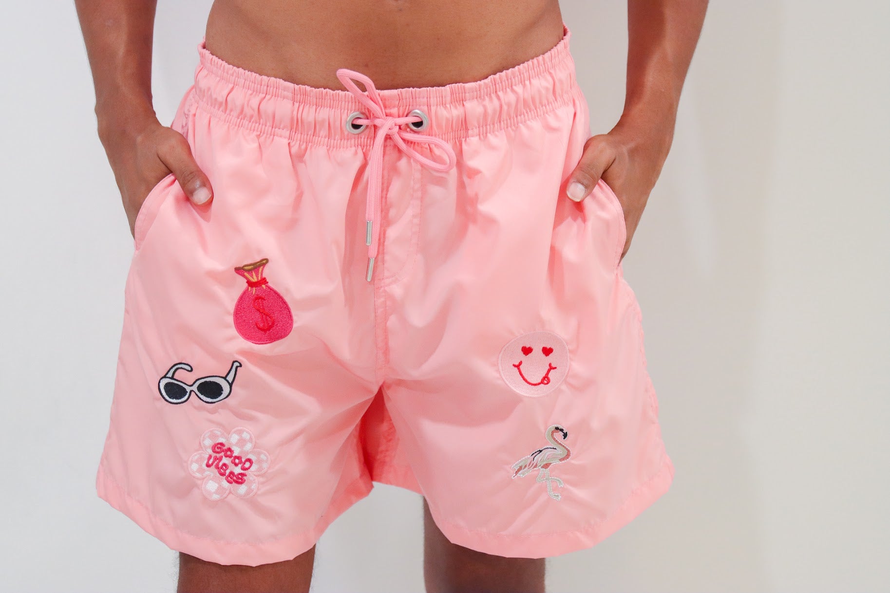 Sakura swim shorts that blend soft style with playful edge. Set in vibrant sakura pink, this piece features stitched details that say it all: carefree sunglasses, a chill flamingo, a happy face, and flashes of cash. Whether you're poolside or oceanside, Sakura brings the vibe: relaxed, rich in energy, and full of feel-good fun.